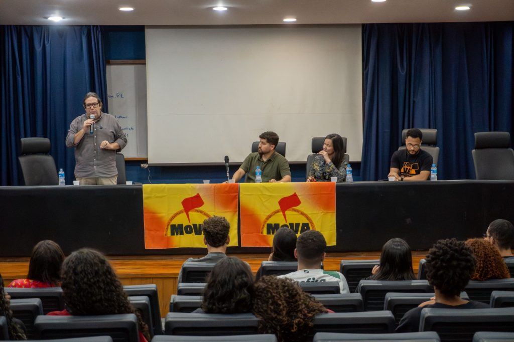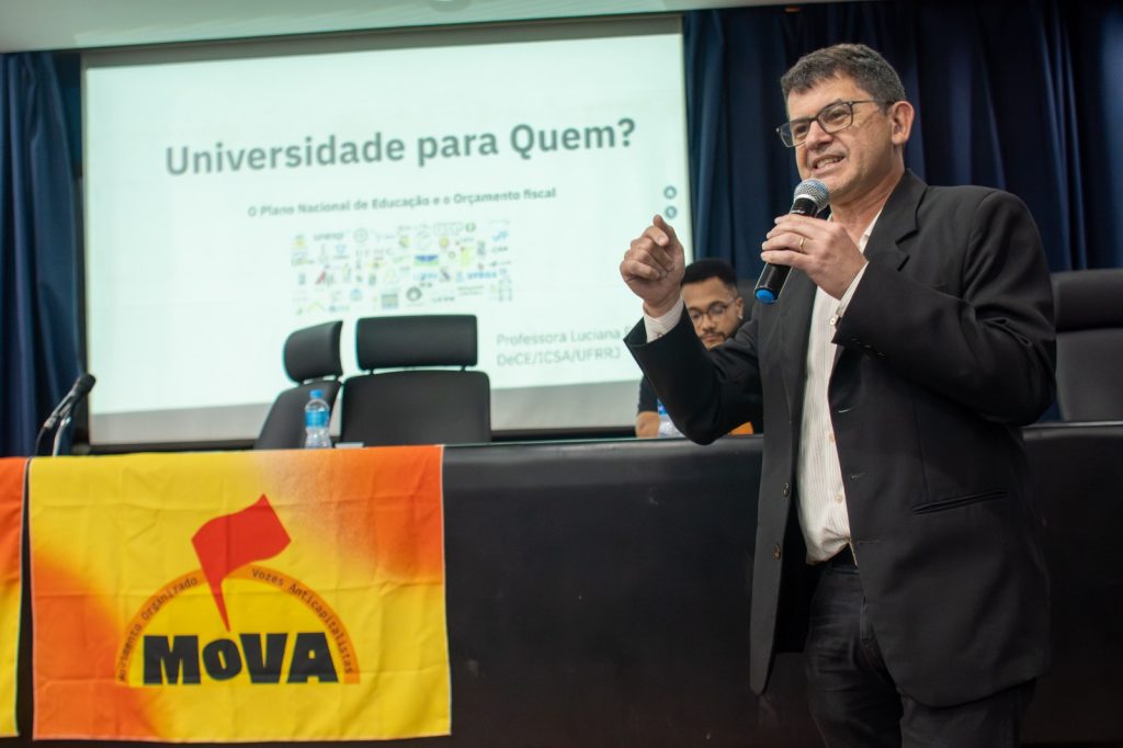 A professora Luciana Ferreira iniciou o debate apresentando um panorama sobre a trajetória das universidades públicas federais ao longo das últimas décadas, problematizando a quem elas têm servido. Ela ressaltou que, se por um lado, a adoção de políticas inclusivas nos primeiros governos petistas ampliou o acesso de estudantes de baixa renda, consolidando a UFRRJ como referência de universidade da Baixada Fluminense que acolhe alunos em situação de vulnerabilidade social e econômica, por outro lado, a última década foi marcada pela estagnação e redução das verbas destinadas à manutenção das instituições federais. A professora deixou claro que esse cenário compromete não apenas o ingresso, mas sobretudo a permanência dos estudantes, refletindo-se em elevadas taxas de evasão e no processo de sucateamento do ensino superior brasileiro.