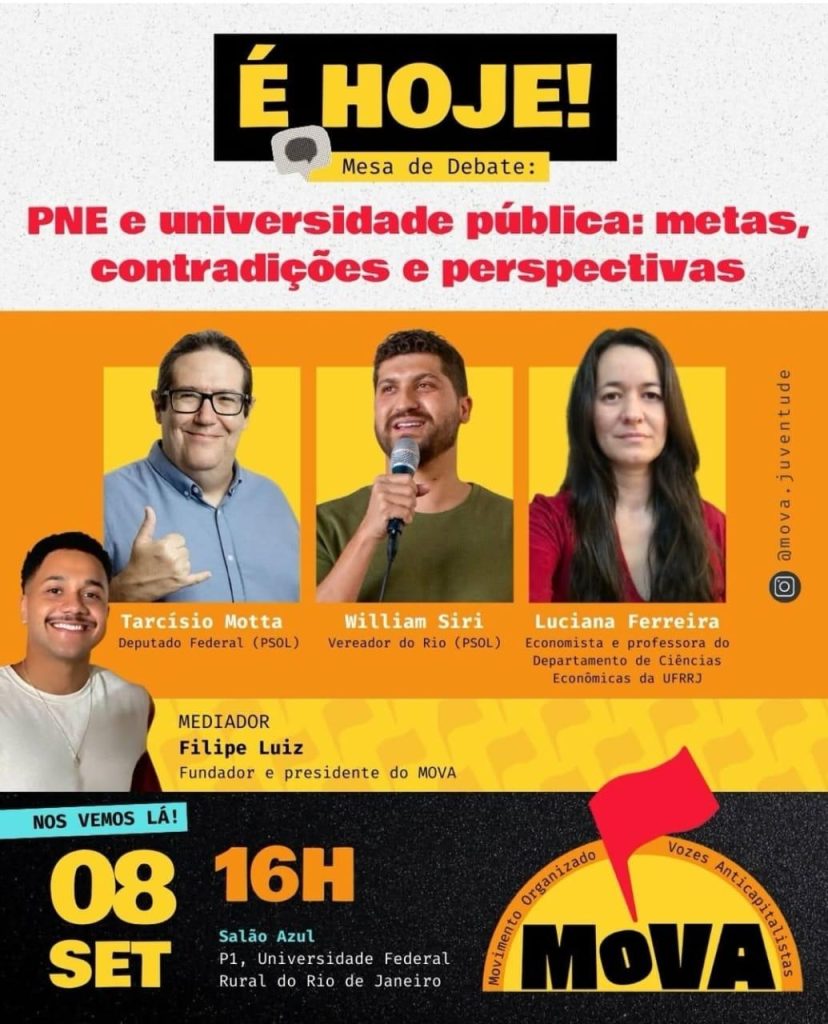 No dia 08 de setembro de 2025, foi realizada, no Salão Azul, no 3.º andar do P1, uma Roda de Debate sobre o novo PNE (Plano Nacional de Educação), intitulada “PNE e universidade pública: metas, contradições e perspectivas”, promovida pelo coletivo estudantil “MOVA” (“Movimento Organizado Vozes Anticapitalistas”), que teve como palestrantes: o vereador da cidade do Rio de Janeiro, William Siri; o deputado federal Tarcísio Motta; e a professora Luciana Ferreira, representante dos docentes do campus de Seropédica na CPA/UFRRJ – Comissão Própria de Avaliação da UFRRJ, e que contou, ainda, com as presenças de Roberto Rodrigues e de César Da Ros, reitor e vice-reitor da UFRRJ, respectivamente, e do vice-presidente da CPA/UFRRJ, Marcelo Barroso Alves Pessoa.